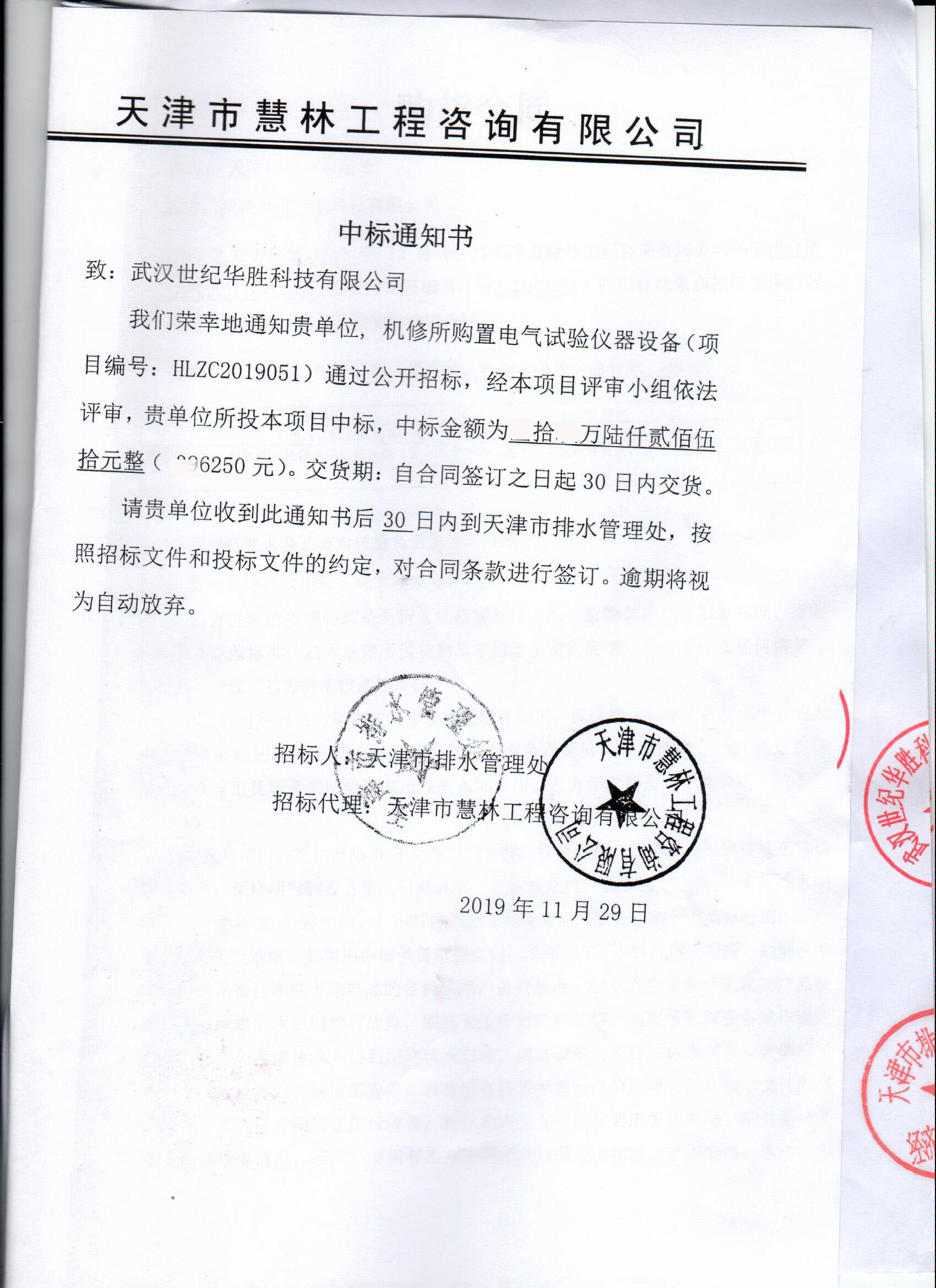 熱烈祝賀:武漢世紀華勝在天津市排水管理處機修所購置電氣試驗儀器設備項目中標