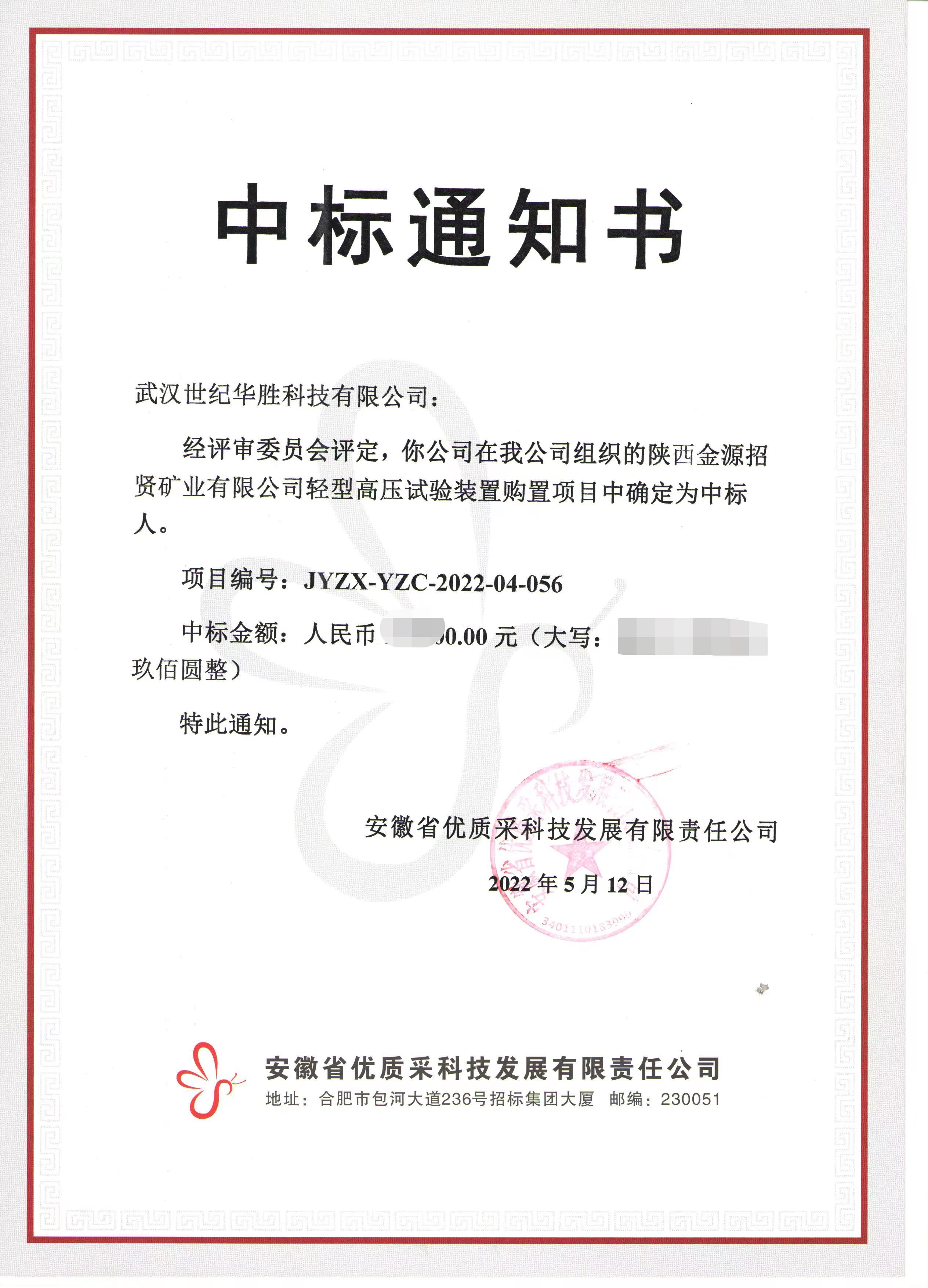 武漢世紀華勝科技有限公司在陜西金源招賢礦業有限公司輕型高壓試驗裝置購置項目中中標